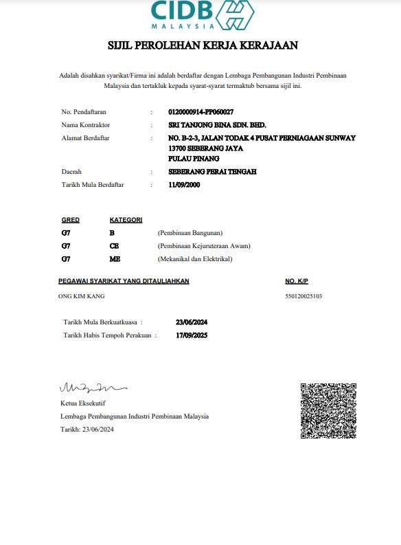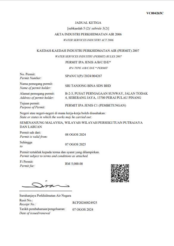 Sri Tanjong Bina Sdn. Bhd. is a registered contractor recognized by the relevant authorities in Malaysia’s construction and water services industry. Our certifications reflect our commitment to professional standards, regulatory compliance, and responsible project delivery.